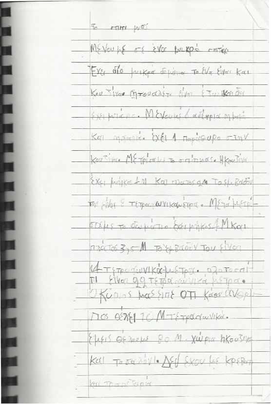 Μένουμε σε ένα μικρό σπίτι. Έχει δυο μικρά δωμάτια το ένα είναι και κουζίνα. Η τουαλέτα είναι έξω και δεν έχει μπάνιο. Μένουμε τα 6 αδέρφια η μαμά και η γιαγιά. Έχει ένα παράθυρο στην κουζίνα. Μετρήσαμε το σπίτι μας. Η κουζίνα έχει μήκος 4 μέτρα και πλάτος 2 μέτρα. Το εμβαδόν είναι 8 τετραγωνικά μέτρα. Μετρήσαμε το δωμάτιο και έχει μήκος 4 μέτρα και πλάτος 3,5 μέτρα . το εμβαδόν του είναι 14 τετραγωνικά μέτρα. Όλο το σπίτι είναι 22 τετραγωνικά μέτρα. Ο κύριος μας είπε ότι κάθε άνθρωπος θέλει 10 τετραγωνικά μέτρα. Εμείς θέλουμε 80 Μ. χώρια η κουζίνα και το σαλόνι. Δεν έχουμε κρεβάτι και τραπεζαρία» (παραρτημα4) [8]