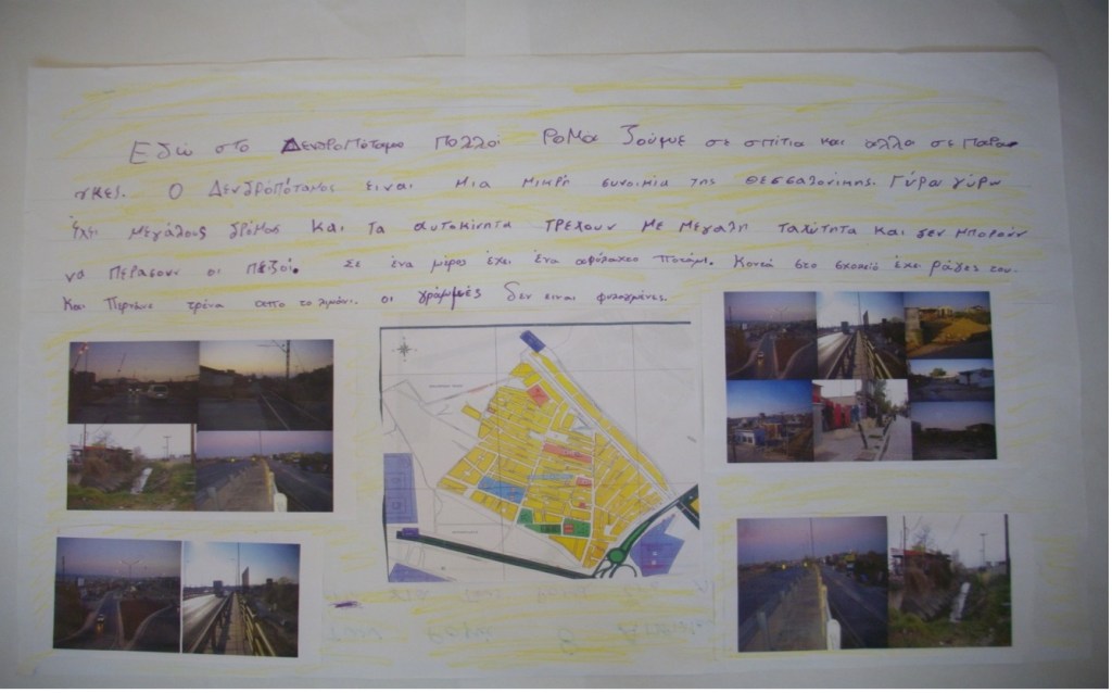 «Εδώ στο Δενδροπόταμο πολλοί Ρομά ζούμε σε σπίτια και άλλοι σε παράγκες. Ο Δενδροπόταμος είναι μια συνοικία της Θεσσαλονίκης. Γύρω γύρω έχει μεγάλους δρόμους και αυτοκίνητα τρέχουν με μεγάλη ταχύτητα και δεν μπορούν να περάσουν οι πεζοί. Σε ένα μέρος [νότια] έχει ένα αφύλαχτο ποτάμι. Κοντά στο σχολείο έχει ράγες και περνάνε τρένα από το λιμάνι. Οι γραμμές δεν είναι φυλαγμένες.» ( Παράρτημα 3 το κείμενο με κολλάζ φωτογραφιών της περιοχής )